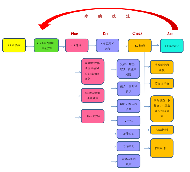 风险管理己被认为是确保企业可持续发展的有效工具。 建立一个完整的职业健康安全管理体系,可以避免大部分的伤害及意外事故,即使在紧急状况下也能以较有效的方式处理及因应。 OHSAS 18001 执行之目的在于透过一套风险评估的办法,找出实际与潜在的职业灾 害及风险,再藉由职业健康安全管理体系予以预防、控制及管理,以防止对环境及员工造成伤害。 OHSAS标准成功地融合了各认证机构对于管理体系的观点,提供给各管理体系机构一致性的认证标准,也由于參与制定OHSAS的单位多为国际性的认证机构,约占80 %全球管理体系的管理体系市场,OHSAS系列顿时成为各组织推行职业健康安全管理体系的标竿,经过2007年进行第一次的改版后,OHSAS 18001已逐渐与ISO 9001及ISO 14001二大管理系统并驾齐驱,并提供企业同时整合完成质量、环境、职业健康安全三大体系的利基。OHSAS18001当前版本2007版,预定在2016年第三季纳入ISO体系内,编号ISO45001 OHSAS 18001的本质包括: 通过自我评估了解职业健康安全损失与风险。 针对重要职业健康安全失与风险制定管理规定与改进计划。 执行职业安全卫生管理规定与计划。 定期检查评估职业健康安全规定与计划。 持续改进职业健康安全表现,承诺符合法令法规及其它相关要求。 想到的要说到,说到的要做到,做到的要有证据。 OHSAS 18001架构 OHSAS 18001职业健康安全管理体系是一套循序渐进的P-D-C-A管理模式(参考下图),经由计划、实施运行、检查及管理审查, 并透过不断的自我体检进行持续改进,以达到零灾害、零事故的目标。